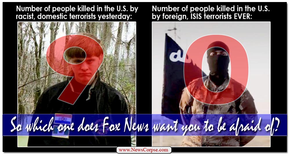 Fox News has also been a critic of studies that show that America is far more at risk due to threats from right-wing, domestic terrorists than from foreign extremist Islamic groups like ISIS. Just the mention of such studies brings outrage from offended rightists who are desperate to avoid seeing the truth. However, the incident in Charleston affirms the studies and reinforces that fact that there have been many assaults perpetrated by rightist individuals and groups, but not a single successful attack by ISIS. Yet which of these does Fox News work so hard to make people fear?
