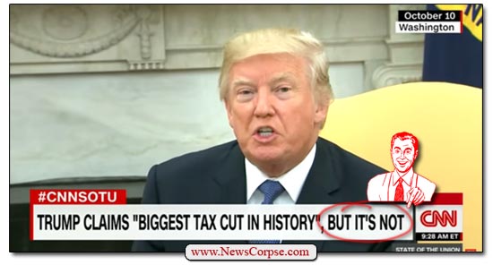 Trump has dived hair first into the tax debate with his customary aversion to the truth. On multiple occasions he has referred to the still stewing tax legislation as the “biggest tax cut in history.” It isn’t. But that didn’t stop his Treasury Secretary (aka the Foreclosure King), Steve Mnuchin, from lying to CNN’s Jake Tapper on behalf of his pathological boss (video below). In this exchange Mnuchin attempts a shady two-step to relocate the goalposts to another county. Tapper addresses the falsehood that Trump is proposing the biggest tax cut in history: