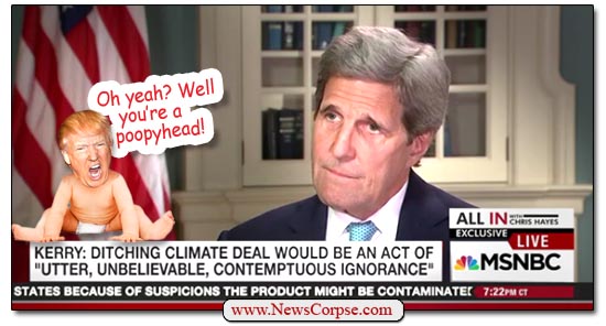 Responding to Trump’s attack on the Paris accords, Secretary of State John Kerry was interviewed on MSNBC’s All In with Chris Hayes (video below). He did not mince words when asked about Trump’s hostility toward the international effort to mitigate the catastrophic effects of climate change: