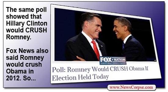Finally, the Fox Nationalists plastered a decidedly biased headline on the article that ignores far more relevant data from the same poll. In a hypothetical contest between Romney and Hillary Clinton, Clinton would beat him by an even bigger margin in double digits (55-42). While all polling of this type is speculative, this has more merit in that it represents a real possibility in 2016. While no candidates have confirmed that they are running at this point, we know for certain that Obama will not be one of them. Fox is clearly fixated on the past and is oblivious to the future.