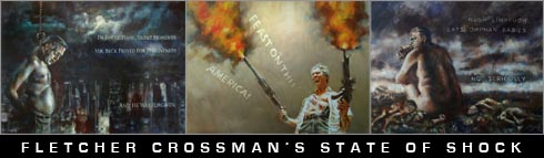 Fletcher Crossman, a British artist currently residing in the U.S., has opened an exhibit at the Eye Level Gallery in Charleston, SC, that explores this hostility and projects it out to its darkest conclusions. The pieces include Glenn Beck swinging from a noose over a gloomy New York skyline and Rush Limbaugh feasting on a pile of infant corpses. Interspersed are images of the media portrayal of similarly gruesome events including the assassination of President Obama. The media is not a peripheral addendum to the exhibit, but an integral part of the unfolding message. Crossman described the role of the media in comments to a local Charleston reporter: