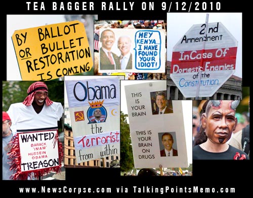 Just two weeks later, the 9/12 Project held a rally sponsored by many of the same people who brought us Beck’s Revival Meeting on the Mall, including Americans for Prosperity and FreedomWorks, It was also attended by the same deluded masses that genuflected before Beck, however, there was no prohibition of poster-boarded speech. The result is this representation of the sign carriers that would surely have graced Beck’s event had he permitted them: