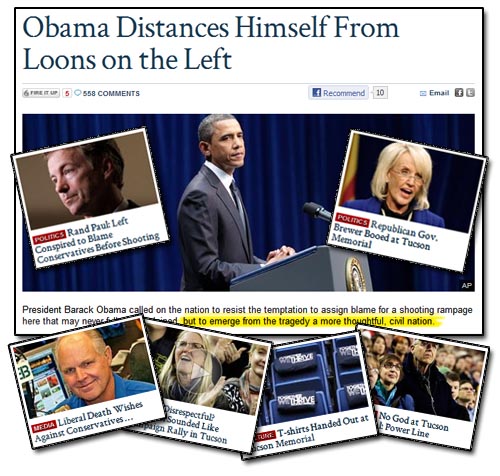 The featured headline on Fox Nation reads: Obama Distances Himself From Loons on the Left. The Fox Nationalists are apparently incapable of refraining from disparaging rhetoric for even a few hours. They are also incapable of noting the sick irony that their own insulting headline article began with a call for thoughtfulness and civility: