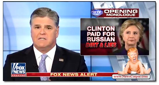 You have to wonder why Hannity thought that would benefit his buddy Trump. He could have simply talked about the Dossier in disparaging terms and left it at that. But no. This genius thought visualizing Russian hookers urinating on Trump had to be a feature of the broadcast. Never mind that the entire story involving who paid for some routine opposition research doesn’t even come close to the scandal of enlisting Russians to tamper with an American election. Clearly they are pretending to be more interest in who paid for it than what’s in it. But all of this just illustrates how desperate they are to deflect from the real news and to attack their perennial foe, Hillary Clinton, who holds no office and says she never will.