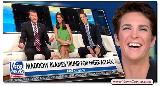 Maddow’s report was taken up on Fox and Friends in a segment (video below) that featured a graphic declaring that “Maddow Blames Trump For Niger Attack.” And since the mission of Fox News, and especially Fox and Friends, is to defend Trump no matter the subject, the F&F crew went to work. They began by asserting that the events Maddow discussed were entirely separate and had no possible relation to one another. Of course, anyone with a functioning cerebral cortex could see the direct linkage. Lacking any substantive rebuttal, co-host Pete Hegseth attempted to mock Maddow’s thoughtful demeanor rather than her facts. Then he accuses her of spinning a wild conspiracy theory as “the leader of the left.” But perhaps the most idiotic remarks were offered by co-host Abby Huntsman, who said this”